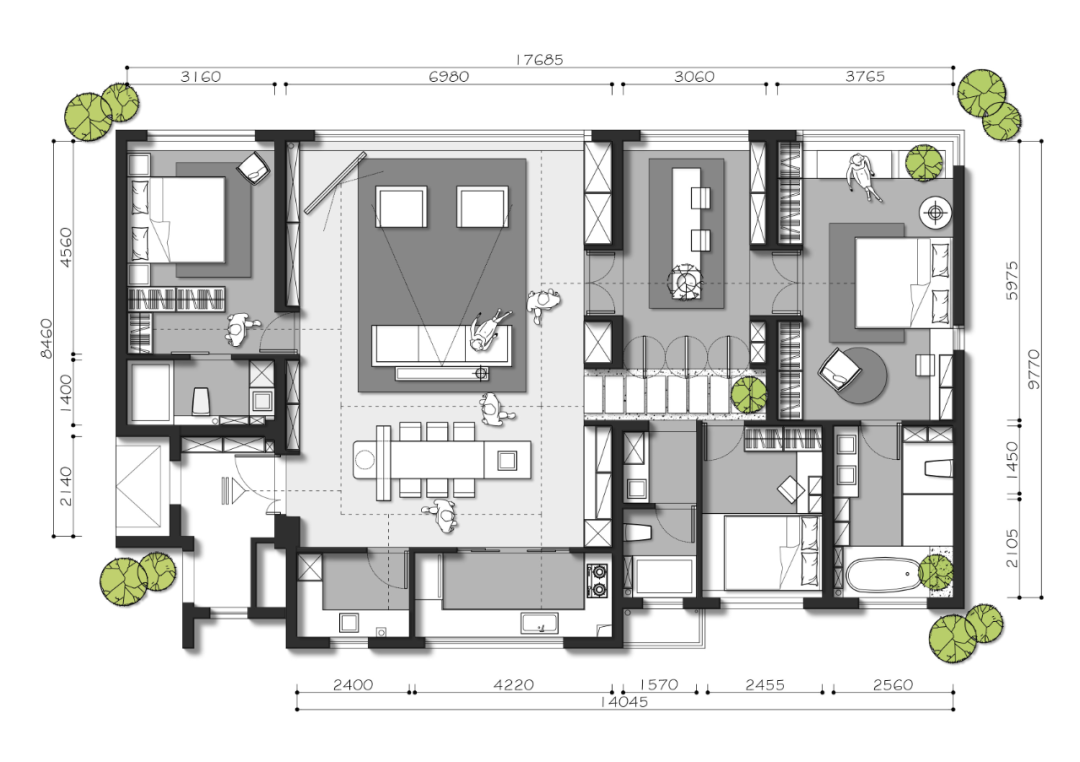 以线条感为空间骨骼:利落横纵线条勾勒墙体、划分区域,摒弃繁杂装饰,