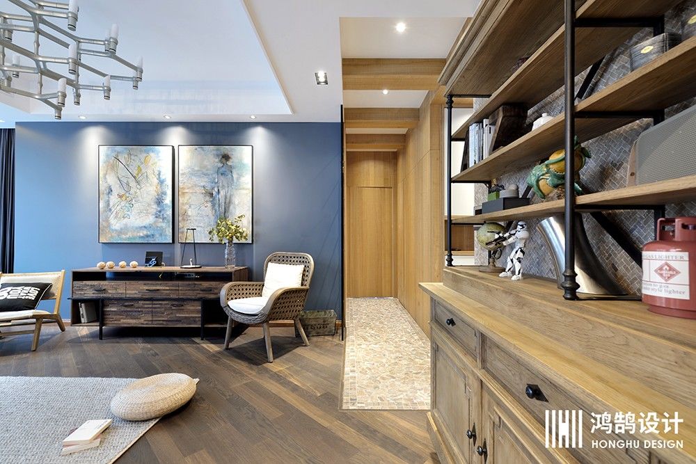 空间构架上,设计师选用各种实木木料拼合组成,老船木的苍劲和胡桃木的精致,形成碰撞。