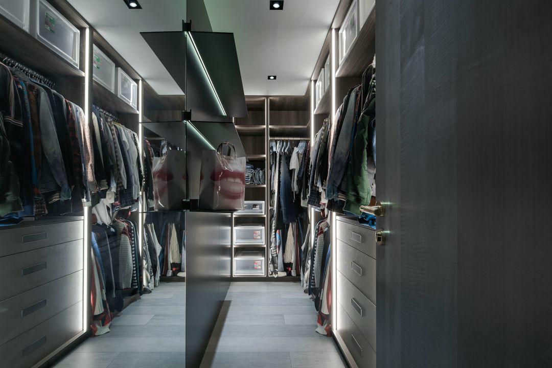 无论是玄关隐藏式鞋室,还是每位家庭成员独有的衣帽间,在开阖与隐匿之间,Lita要求的储物空间被完美释放。本案不仅在大局上对空间的把控、色彩的塑造都极为用心;在装饰细节方面,如踢脚、空间门套、顶角以及柜子等处在结构上的重复和统一都精益求精,从各方面都将Art Deco元素尽情诠释。