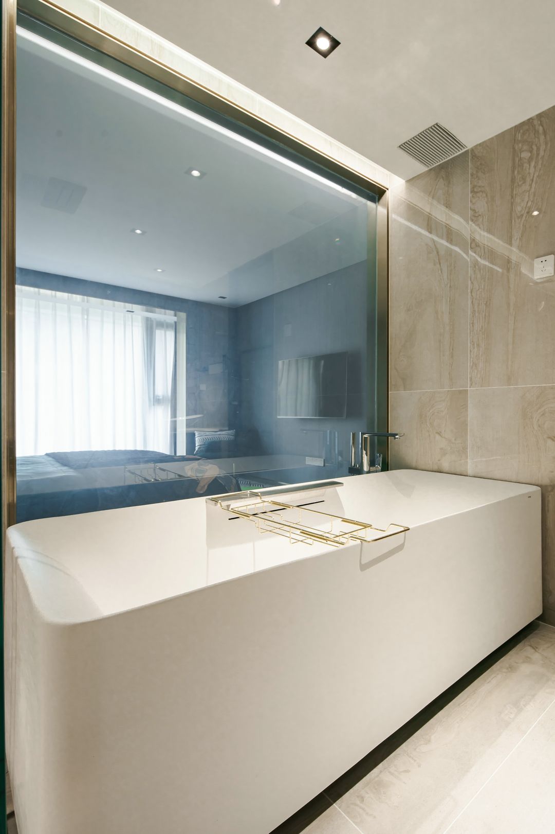 浴室则采用调光玻璃,能控制雾化和透明两种状态,需要时,即时躺在浴缸里也能看到外面的电视,在这样的环境里悠闲地来个泡泡浴,追一集剧,是极为舒适放松的享受。