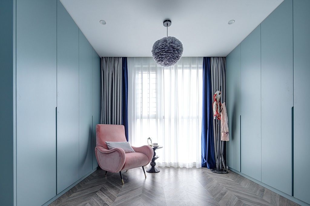步入主卧,最令人拍案叫绝的是粉与蓝的碰撞!当低饱和度的烟粉色遇上浓烈明亮的蓝色,对比鲜明却又和谐融洽,展现出张扬的浪漫。