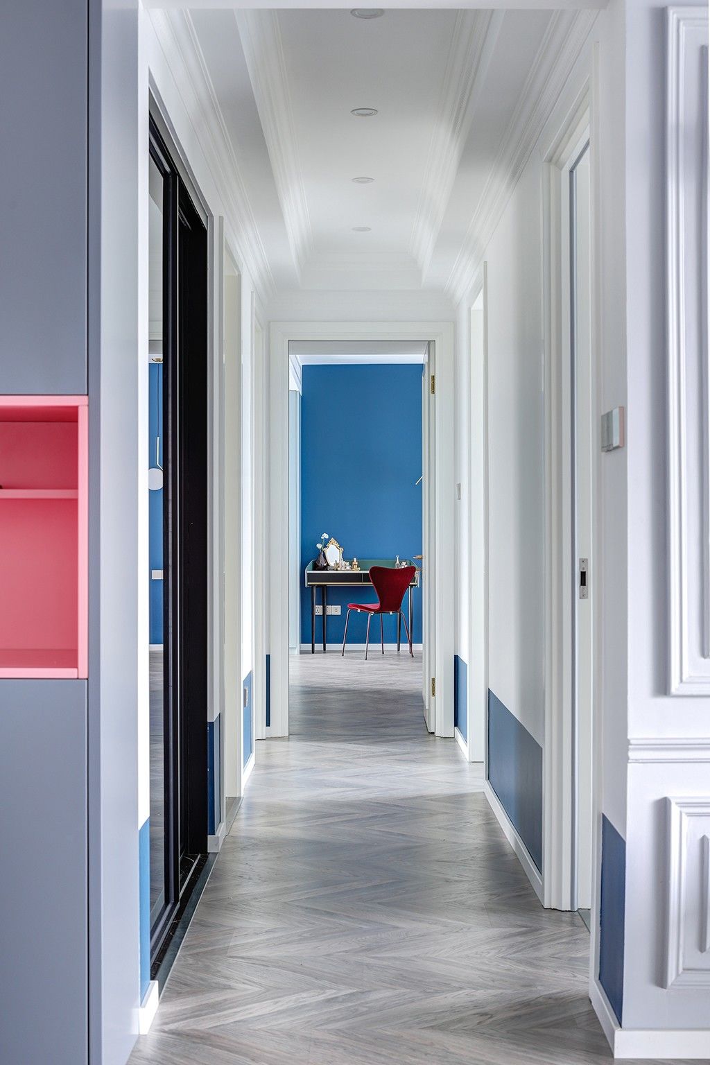 原房为两套打通的双拼户型,过道梁位偏低,索性采用跌级线条的处理手法将梁位弱化,使整个过道独自成景。同时,巧妙地运用蓝白分色,丰富视觉层次感,有通向殿堂的仪式感。
