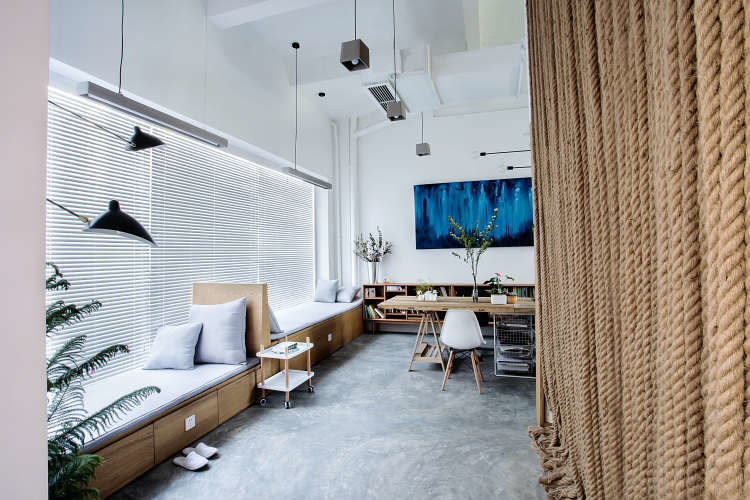 温润白橡台面搭配软绵的垫子像是席地而坐的感觉,夏天随便丢两个蒲团,啤酒和谈天是绝配。卡座搭配大家的喜好,或高或矮,想打盹儿的时候拉上百叶窗,任阳光洋洋洒洒吧。
