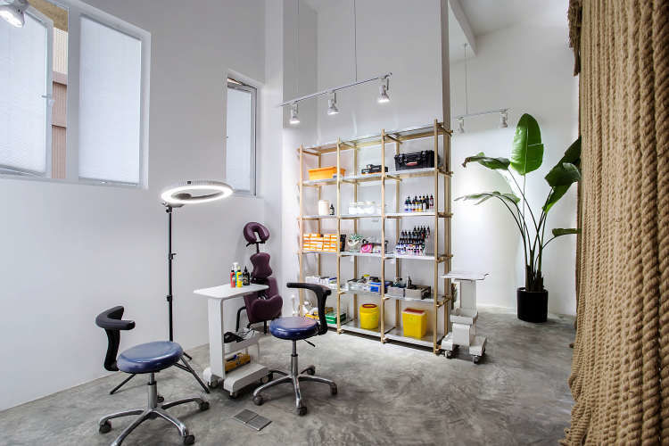 纯白与灰的墙地面,简洁布置中没有其他多余,无影灯投射出洁白专注的光线,工作椅与台,营造非常完整的沟通交流和创作纹身的过程,方便取拿的木质镂空置物架放满纹身所需的工具,白色轨道灯的光一如细细照在颜料瓶上。
