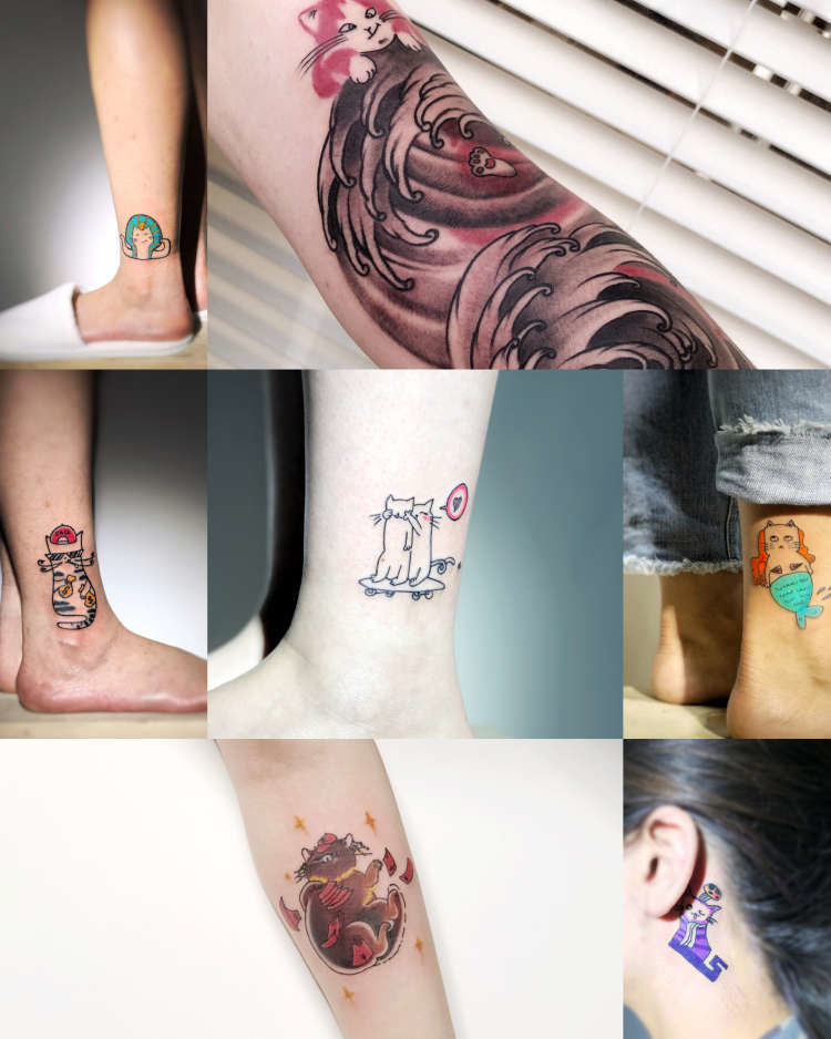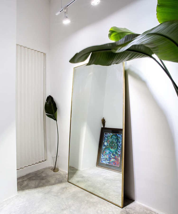刺青区后面途径洗手间的过道上,一面高大的落地镜扩大了空间感,往一旁折叠的洗手间门更好的融入了白色墙面。在这个小而私密的空间里可以安心欣赏方才收获的图案,仿佛可以看到、听到、触摸到图案上的每丝色彩在呼吸。