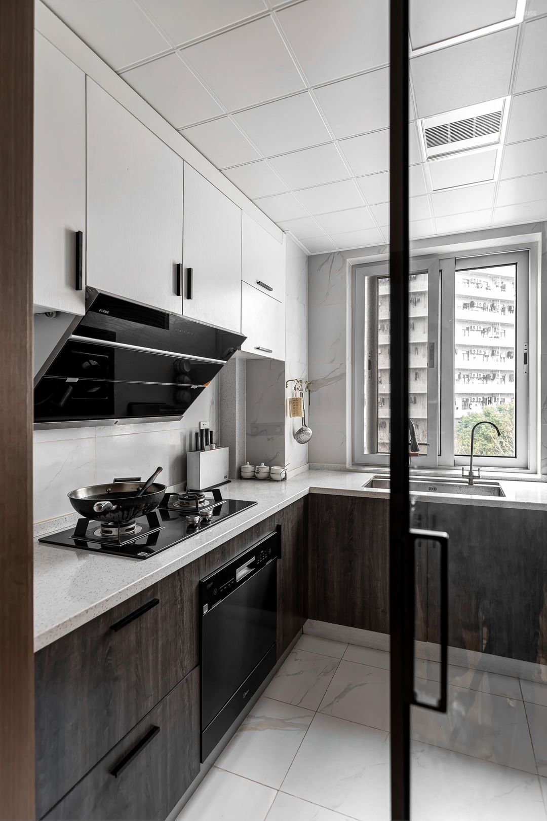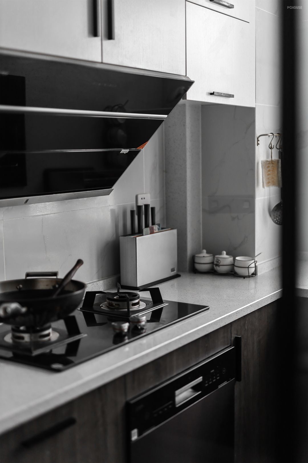 原北阳台改设西厨,高柜容纳烤箱,L型台面兼备水吧的功能。泡茶、咖啡、果汁、烘焙等等都可以在这个空间实现。