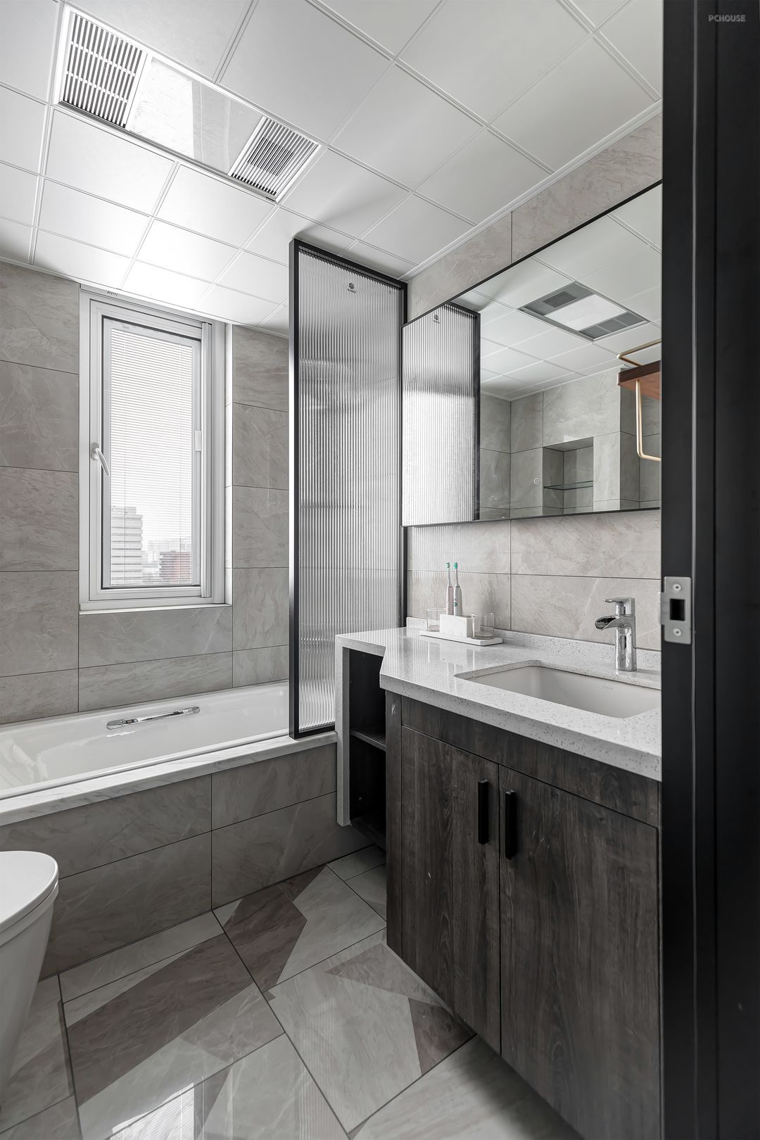 浴缸区域与台盆间,使用一面长虹玻璃隔断,最大程度防止水的溅出,同时,长虹玻璃视觉效果更佳,便于打理。
