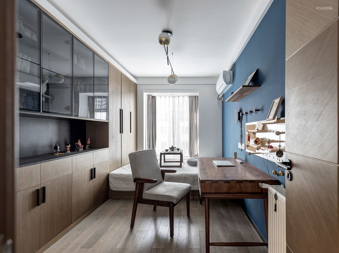 书房一面,书柜、储物柜与展柜的组合,另一面经典蓝色,让空间显得静谧悠然。