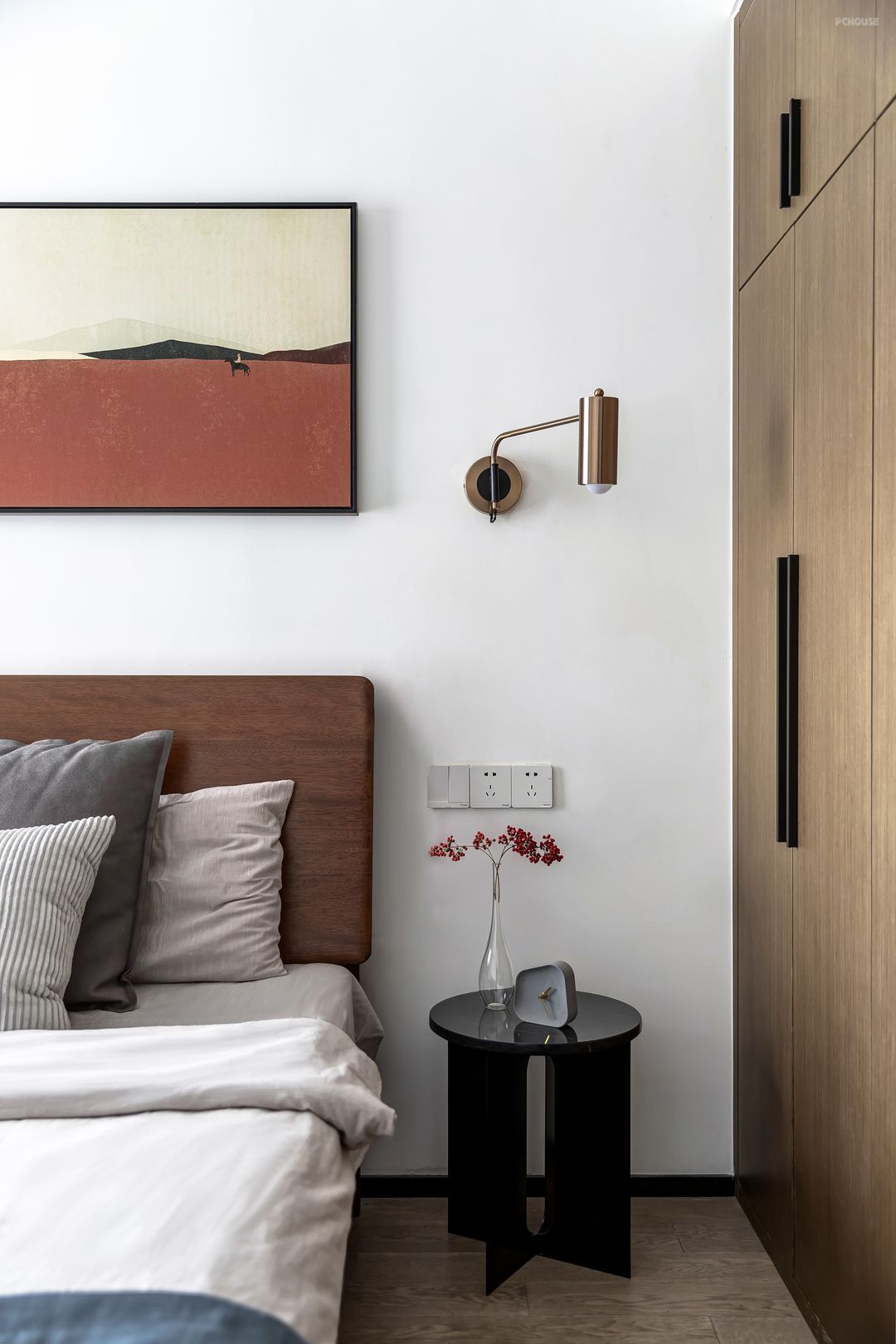 主卧与公共空间统一,沿用了木饰面材料,将整个L型飘窗包裹,整体格调素雅;背景墙选择了橙红色装饰画点缀,这里也同客厅背景的色调统一呼应。