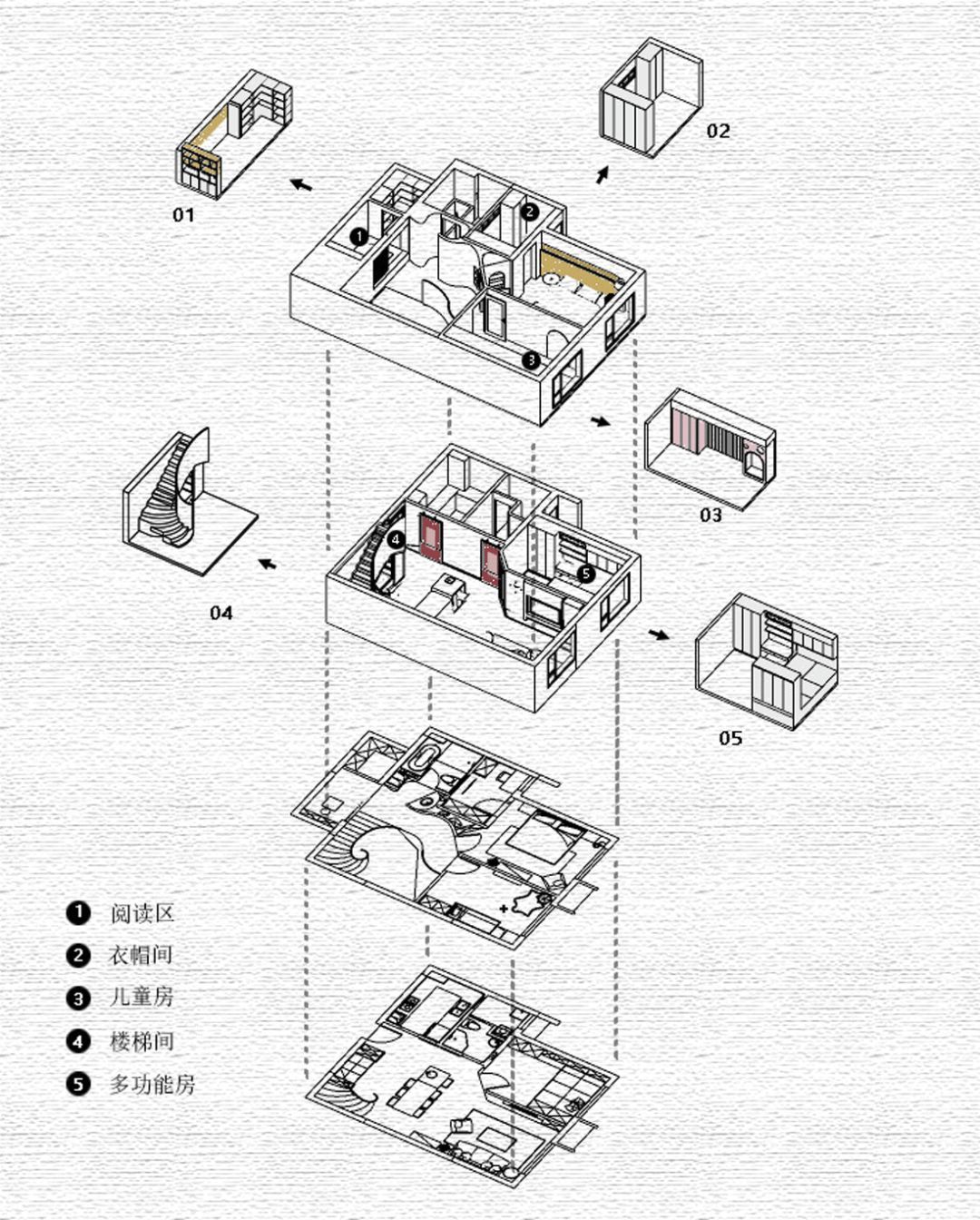 楼梯下的空间我们打造了一块兼具储物或陈列功能的休闲区,独处、谈心、阅读、小孩子间的嬉戏,中心思想就是“随便就好”。