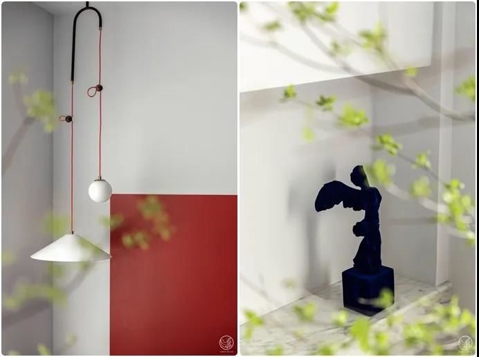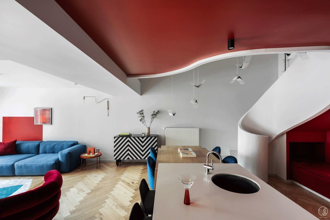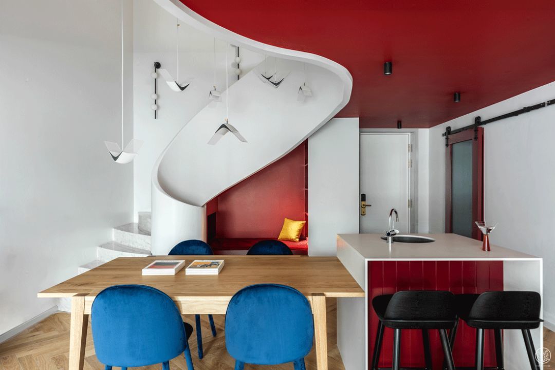 在客厅一角一道浪花般平地卷起的弧线连接起了上下的空间,流线型的楼梯扶手我们用了最纯粹的白色,因它分隔而得来的下部空间我们用了反差感强烈的正红色,不娇艳也许有些夸张,但这个空间缺了它好似丢了魂魄。