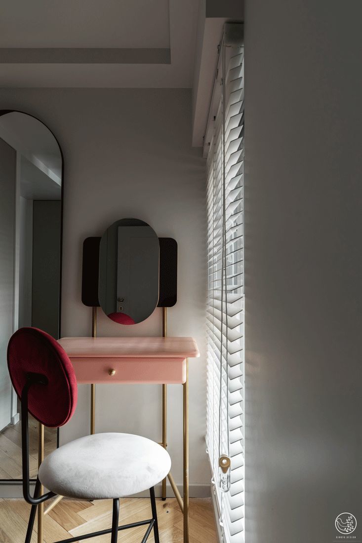 能一眼被注意到的是,黑白相间的几何波浪纹元素是我们在每一个空间加入的“共同点”,点缀也串起每一个空间之间的气息。大理石纹理的墙砖搭配柔和的粉色橱柜,高级感之外隐隐昭示着这个家里谁最常与它“分工协作”。