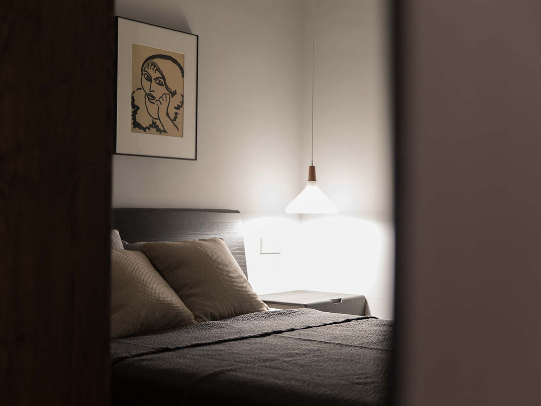 主卧的背景墙木饰面板用了的科定的天然木皮系列K6182PN金丝柚钢刷自然拼,小面积的木纹变化也是自然立体,木纹清晰可见,卧室空间的灯光设计依然相当克制主光源只留了吊顶的L型灯带,氛围光用床头台灯、吊灯和床尾的小射灯打亮挂画和边柜台面