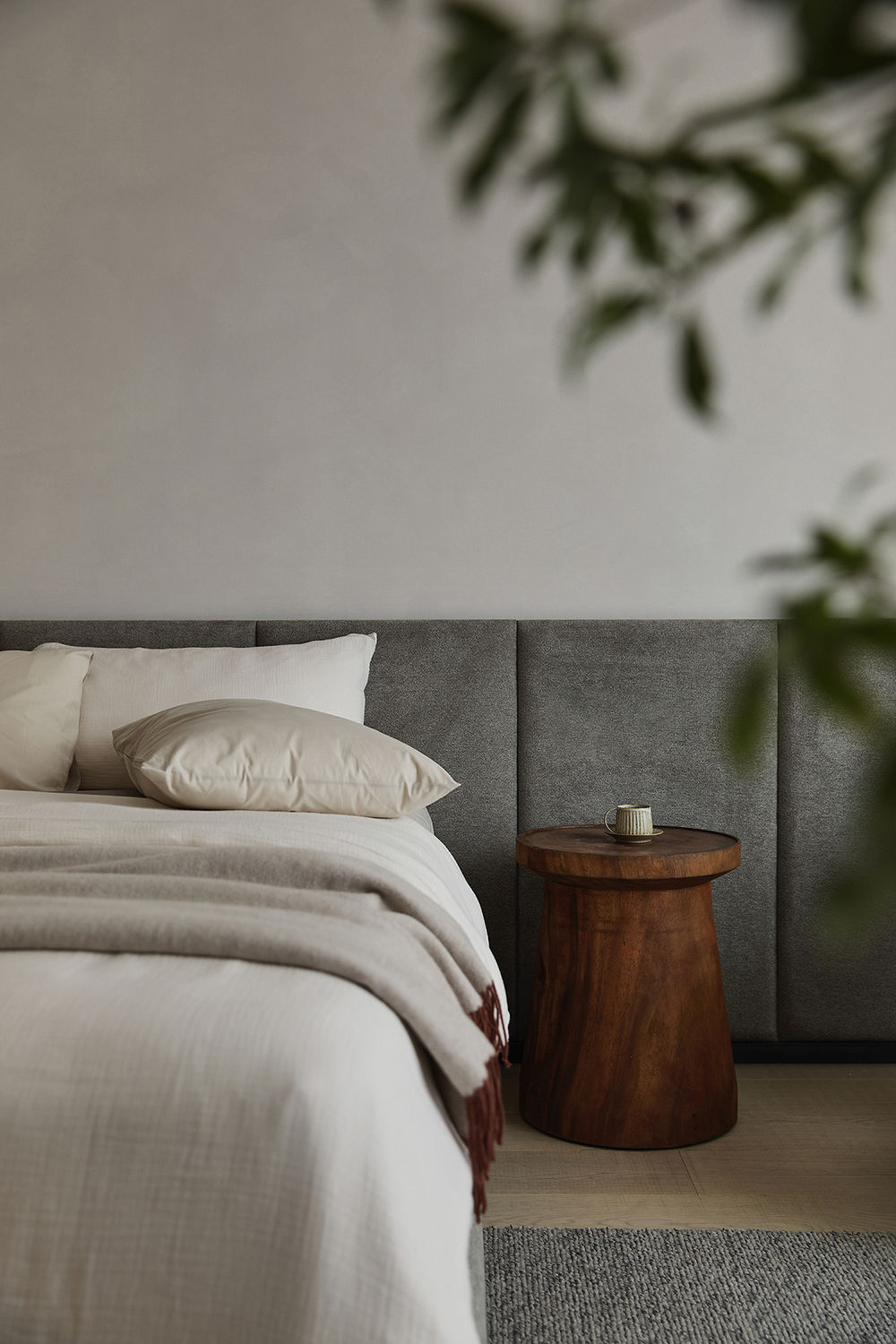 在设计师看来,每一种材质都有着自己的脾性,布艺的轻柔,剑麻的朗硬,木的温煦,各种材质在空间中交汇,酝酿成诗性的语言。大地色肌理感艺术涂料,于墙面清扬漫舞,阳光洒过,光影斑驳的素璞质感依稀可见。