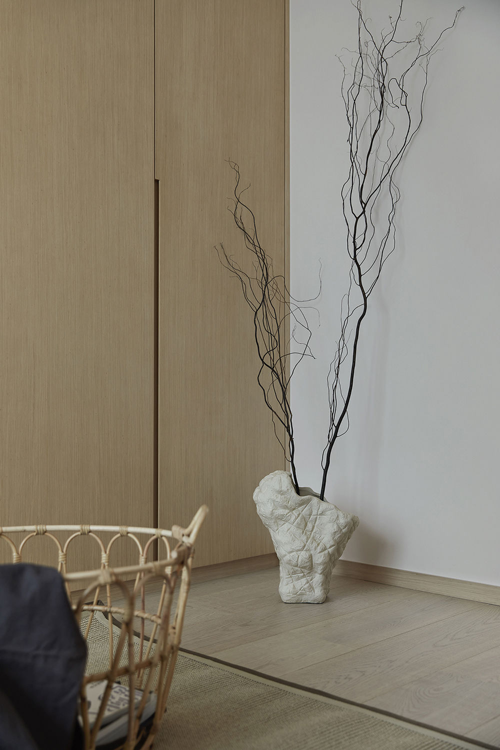 给空间呼吸的自由,只留下日光清风如约而至,拥抱大地之美,仿若踏足秋叶纷飞的林间,静静地隔绝汹涌而来的喧嚣。继续前行,因着一簇柔韧的新绿而眼前一亮,空间的成长与清雅在简素的画面中诗意丛生。