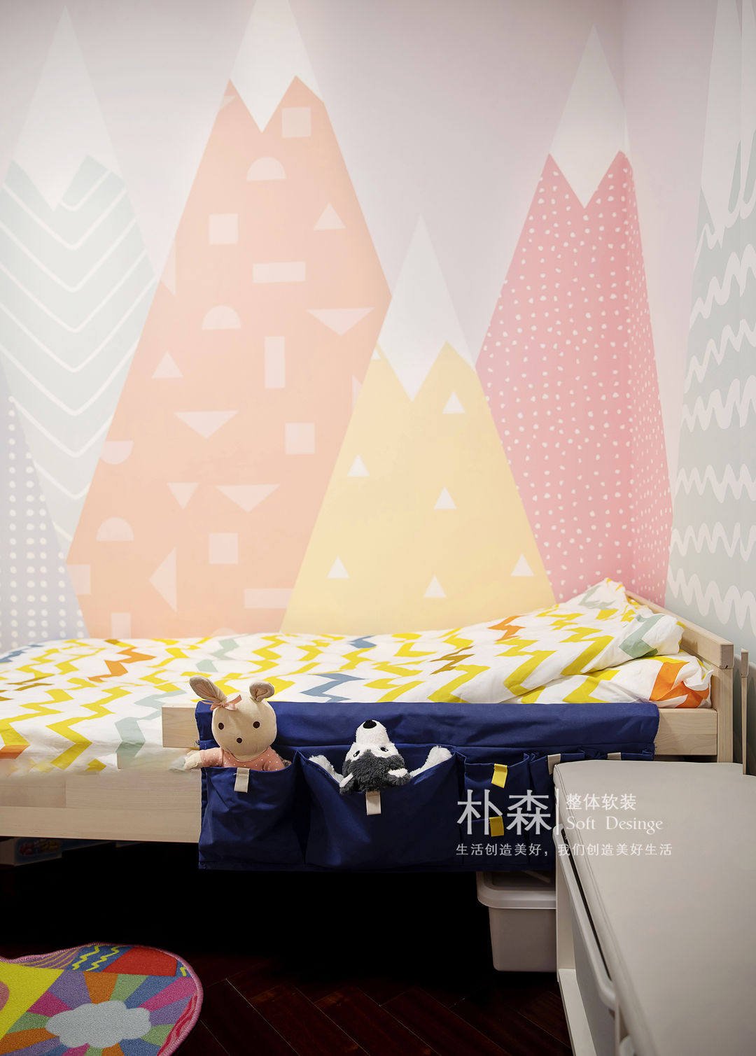 儿童房的设计充分考虑到孩子的成长、学习、娱乐三位一体的理念,色彩搭配以温馨为主引入一些卡通活泼的元素。数字地垫可以是孩子移动的玩具场,同时配置了书写的桌椅,边上配上黑板,使学习与娱乐同步进行。