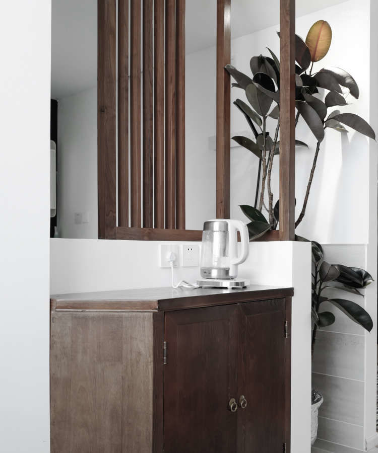 小户型最大的问题应该就是收纳了,所以在餐厅定制了一大面的储物柜,最喜欢柜子中间加个胡桃木格栅。平时用来收纳行李箱,换季棉被,存放杂物等。我的收纳策略就是把杂乱无序都藏起来就对了。