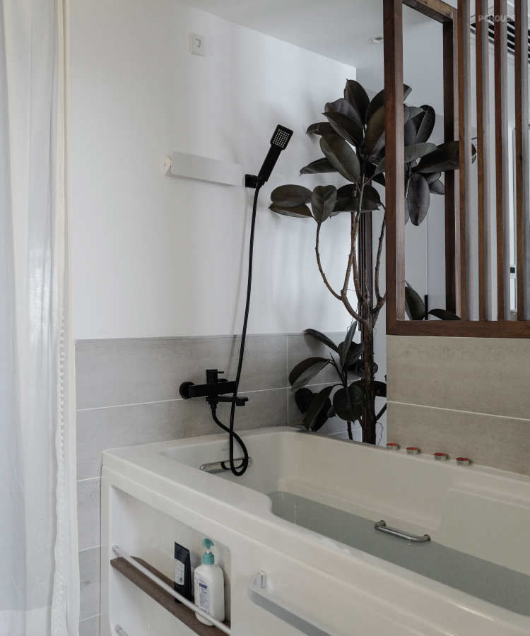 为了再增加一点度假的气氛,设计师还贴心的空出一个可以摆放绿植的角落,整来一株有热带气息的橡皮树,再配点音乐蜡烛香薰,泡在暖暖的浴缸里,这样的度假小情调简直满分!