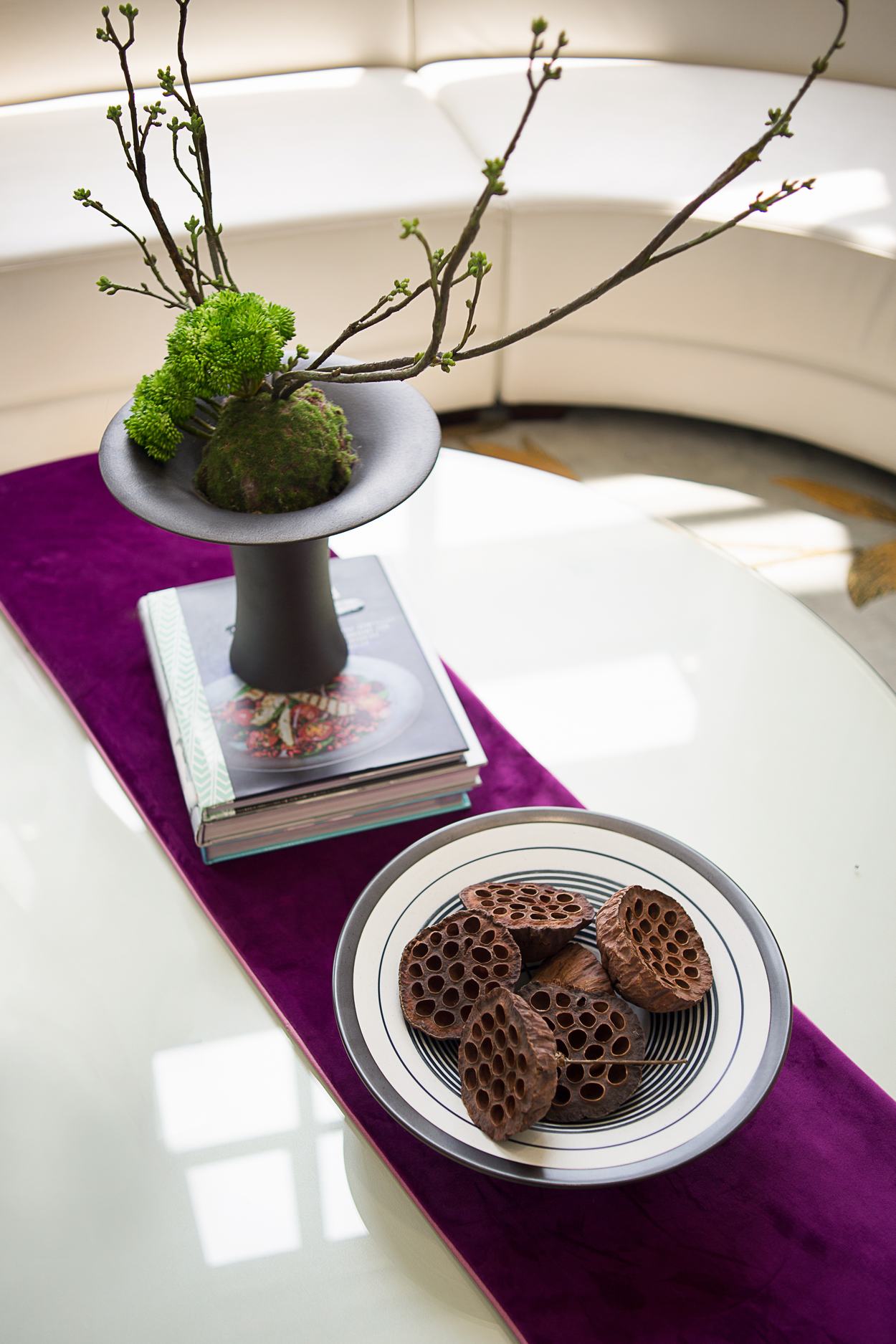 即使在宽敞明亮的客厅里,桌面上的绿植、松果也不显平淡,反而表现出一种勃勃生意。绿植争相吐蕊所彰显的生命力以及松果历经枯荣之后的宁静相融合相生发,整体视觉张力特别强烈。