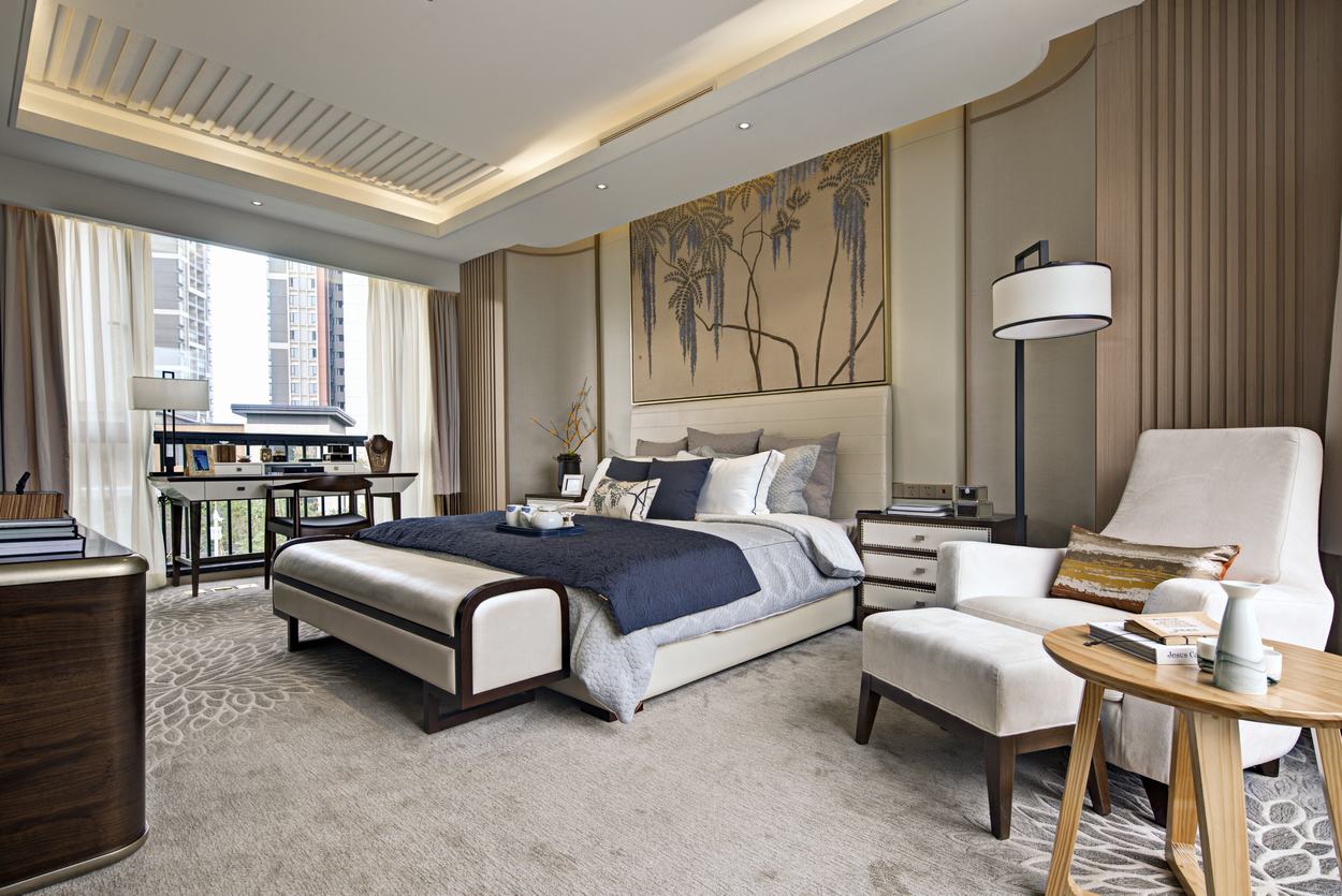 低调洋气的灰绒地毯与纯色橡木的邂逅,令卧室氛围充满温馨,而皮质大床上的松软,又仿佛有种魔力,让人忍不住遐想若是在这里美美地睡上一觉,该是如何地惬意。