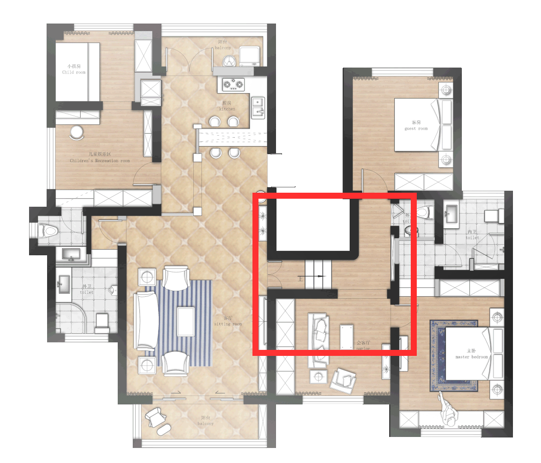 03 增加一个会客厅,客厅用于家庭休闲娱乐,会客厅用于朋友聚会。