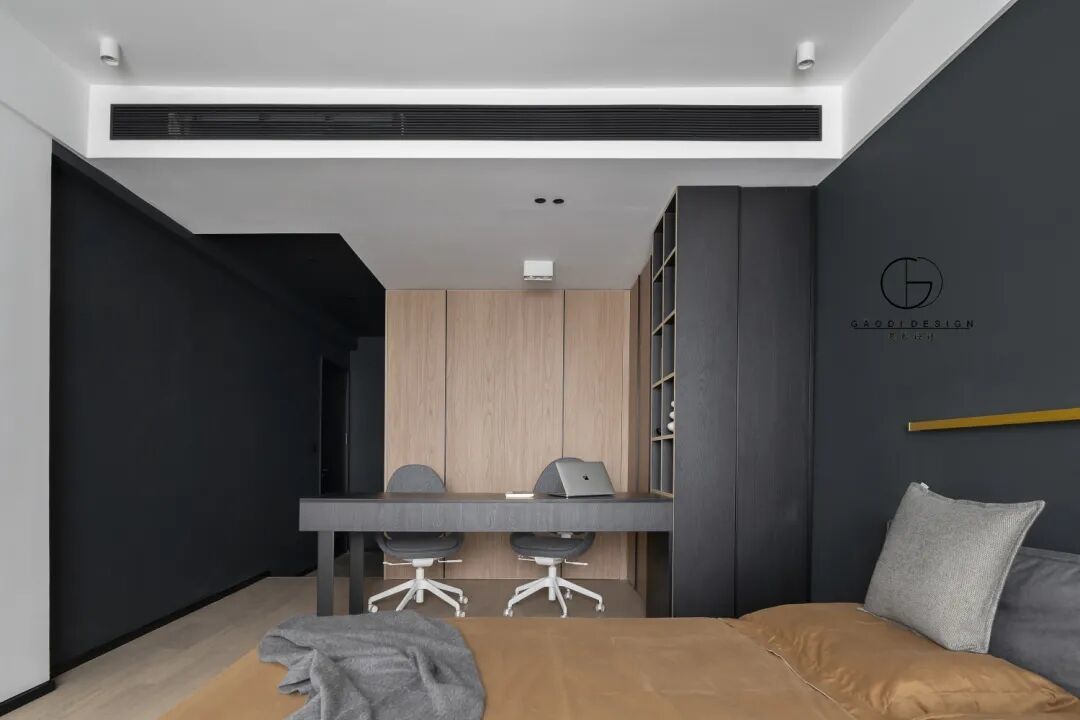 床尾墙体大量留白,保持原始的格调,也是看电影天然的幕墙,当充实且忙碌的一天结束后,泡上一杯红茶,读一本书,看一部电影,然后进入温柔乡,这是大多数人梦寐以求的生活了吧
