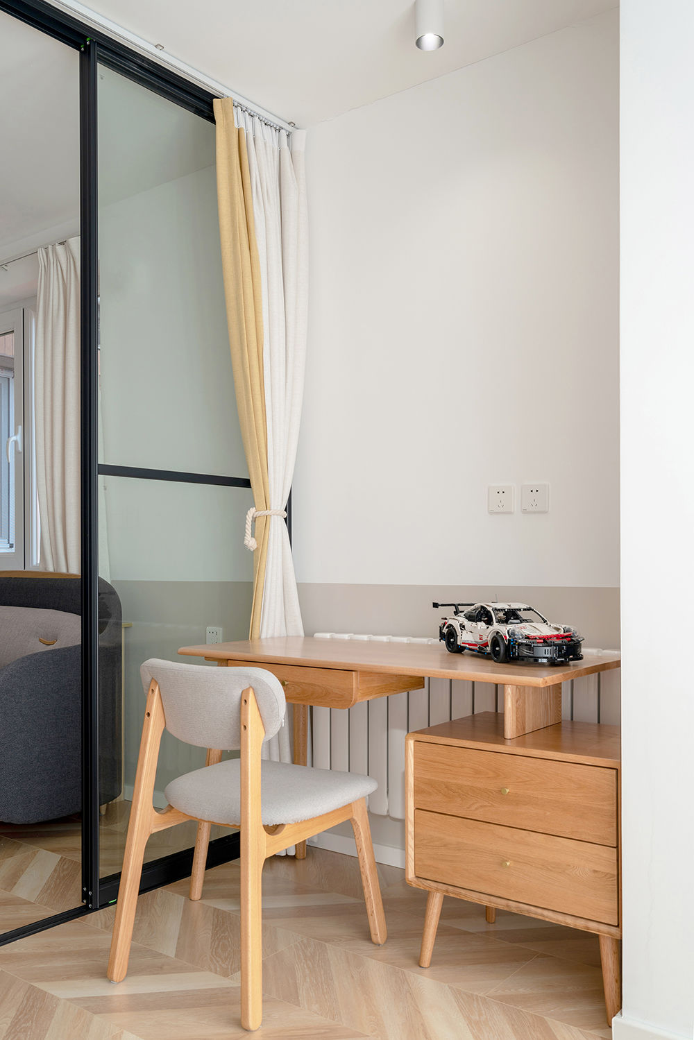 客厅与次卧中间,采用玻璃移门+窗帘来进行分割,平时可以做为屋主的工作间使用,也预备给未来的宝宝,预留出了足够的活动空间。