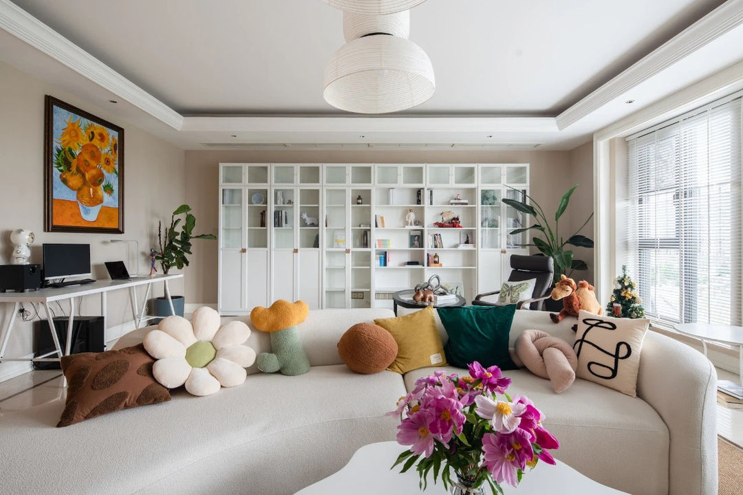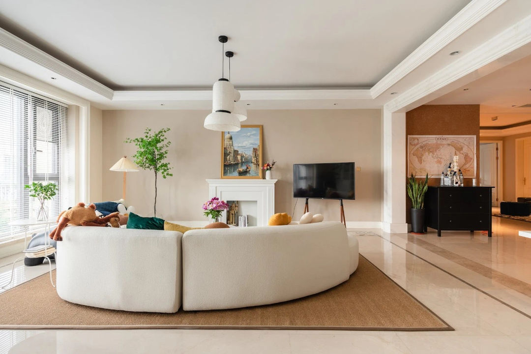 圆弧型还能让这里的行走通道更宽敞些哦~集木室的白色云朵型茶几,即粗犷又圆润,与圆弧沙发更能相得益彰。