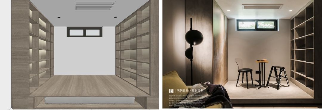 多功能房也作为临时客卧。初期方案设计榻榻米形式,更多考虑收纳功能。后从实际层高与居住功能性上出发,该区域更多以休闲为主,打造出地台式休闲区。在全屋储物足够的前提下,追求颜值舍弃了一定功能性。