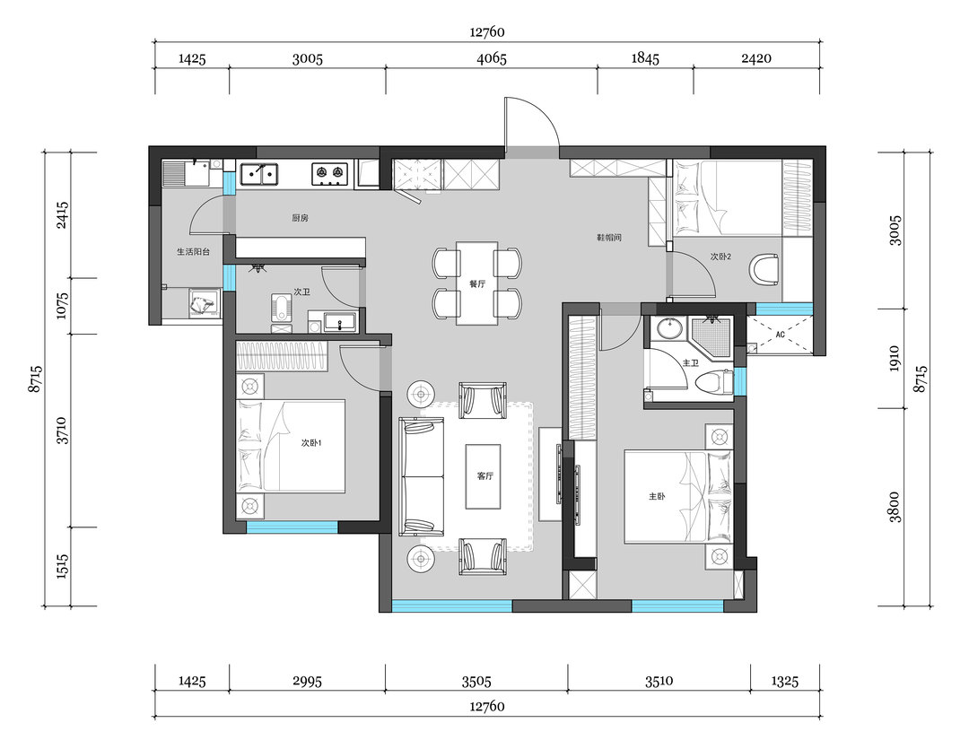 首先要改善使用空间小,完善各个区域的使用功能。所以,客厅纳入了阳台,整体封窗,扩展客厅面积。生活阳台占用空调机位,增加了其使用面积。借用了次卫面积,改变了次卧进门方式,同时增加了厨房、次卧的面积。敞开式厨房,双排台面,外置冰箱,增加使用面积。