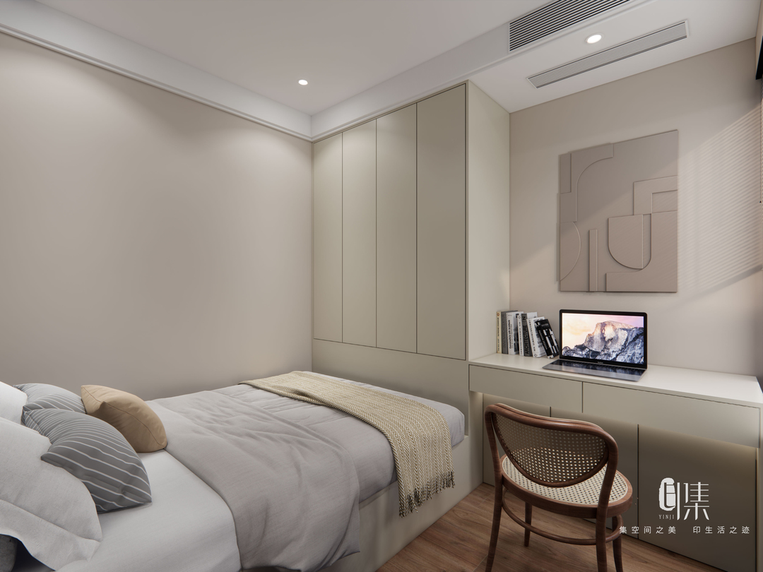 在卧室的设计上,更温柔和轻松是一直延续的主题。次卧的设计上利用打掉的飘窗一端,利用灯具形成独特的景观。利用定制柜体,打造了书桌等,补足了空间功能。