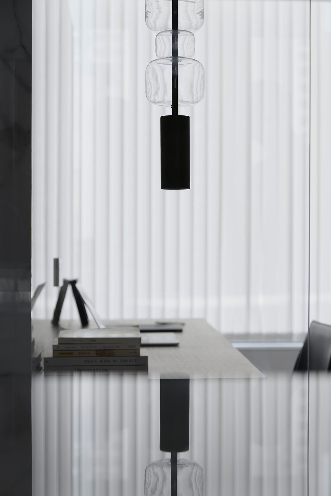 将书房置入到客厅中,以片墙形式分割,既是客厅的电视背景,亦是书房办公书桌。慢慢地走进去,在被簇拥的空间中感受空旷,借由材质特性,比如石材的光感,玻璃的清透,百叶的光影和留白的墙面,完成这一幅“定格”的透明感。