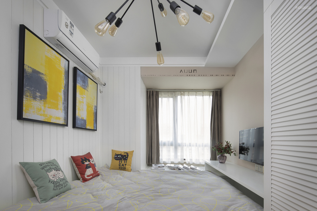 床头和侧面墙用背景板覆盖,视觉上空间拉长。挂画和靠垫呼应了客厅、餐厅的红黄蓝元素。