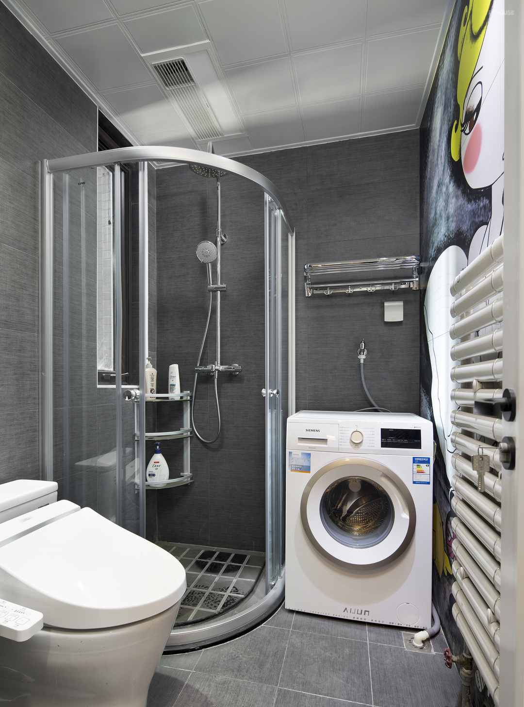 卫生间和厨房风格一致,也是墙面顶面都是灰色。