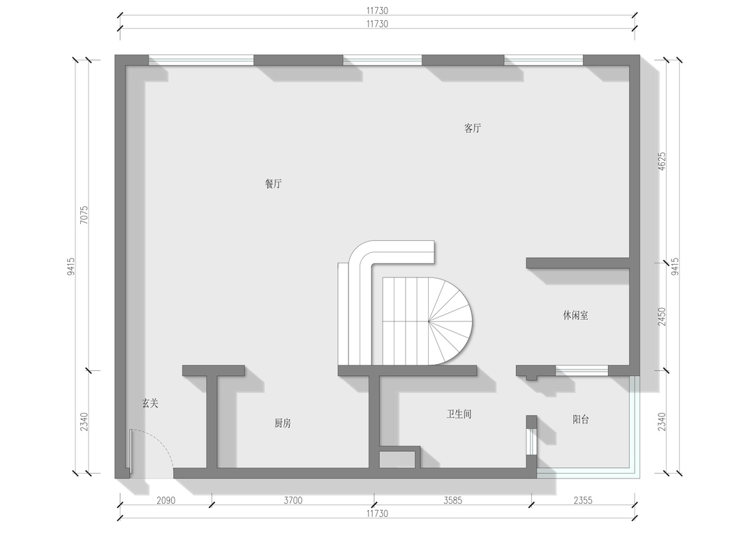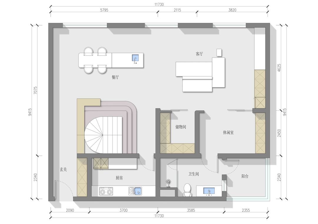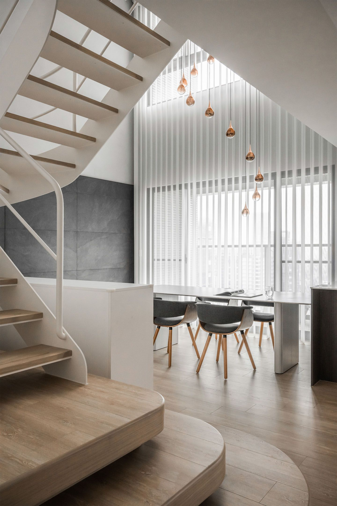 餐厅与旋转楼梯呈一字型布局,楼梯下方合理利用,作为玄关和餐厅空间的基础收纳区。