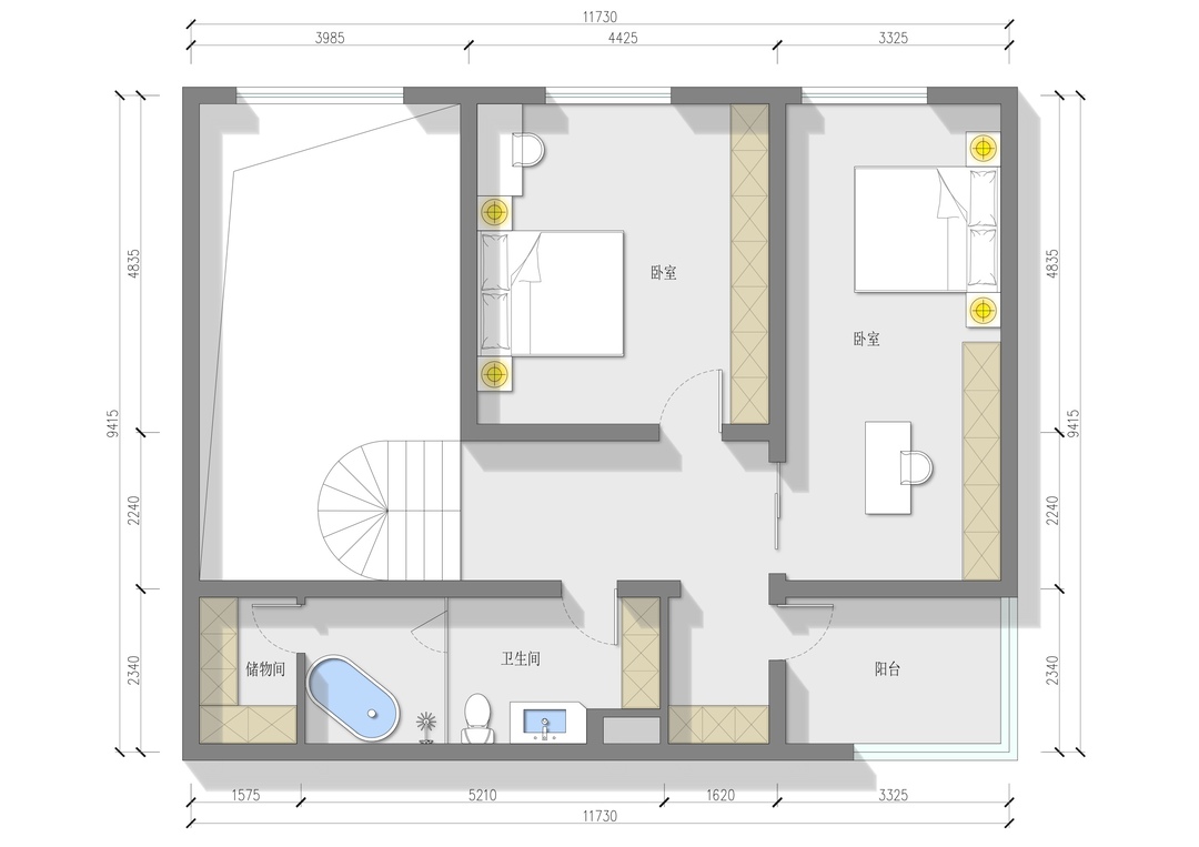1、一楼作为公区使用,二楼则是比较隐私的休息区。