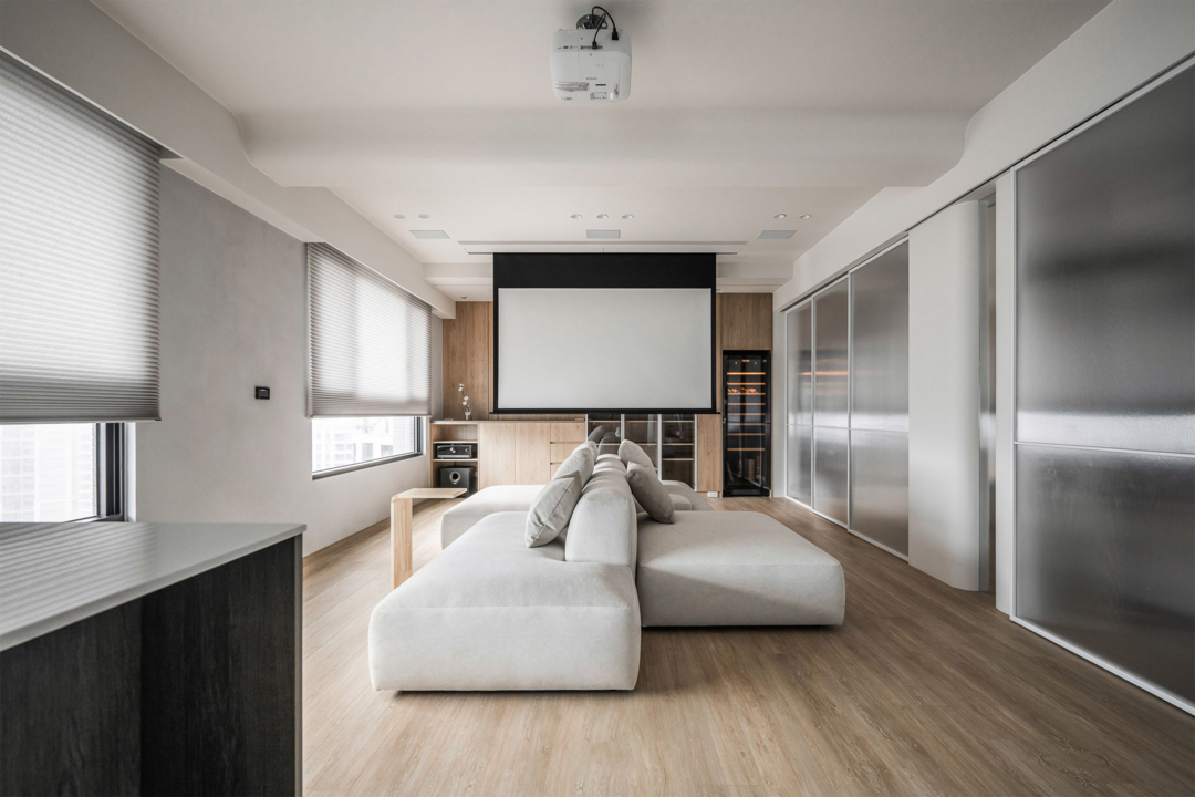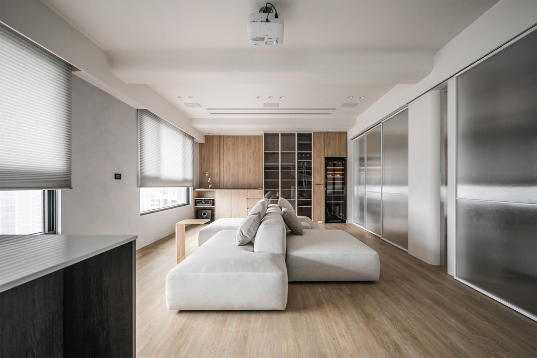 现代极简的横厅设计,整体空间以白色和原木为主,空间简单,细节丰富。极简线条的收纳区、自由组合的沙发、体块感的茶几,各种细节让空间的高级品质彰显淋漓尽致。