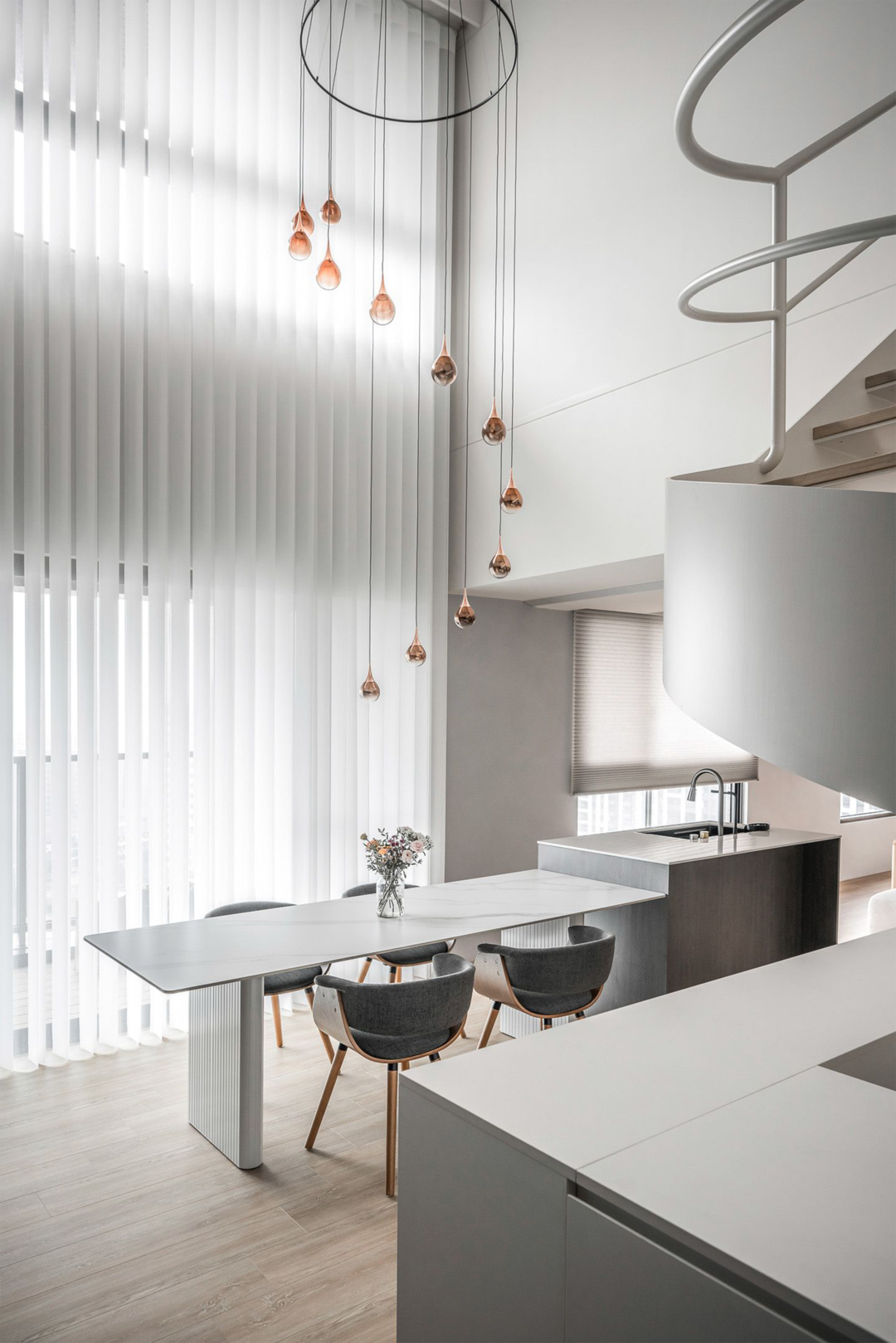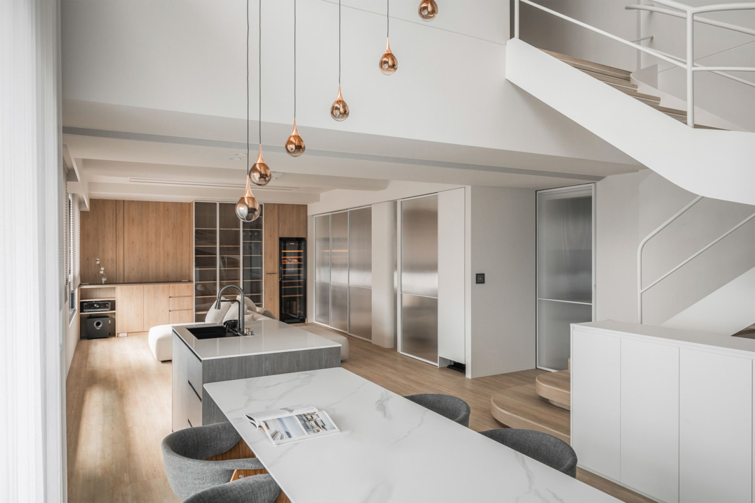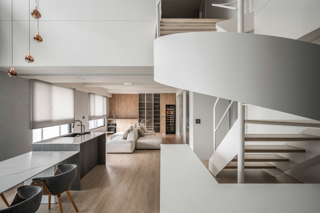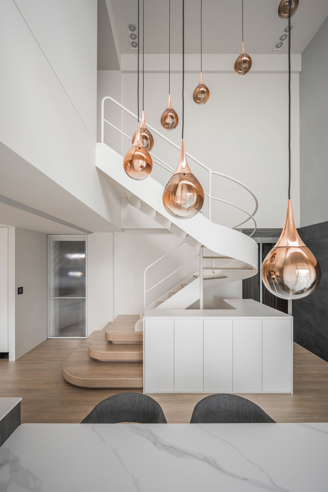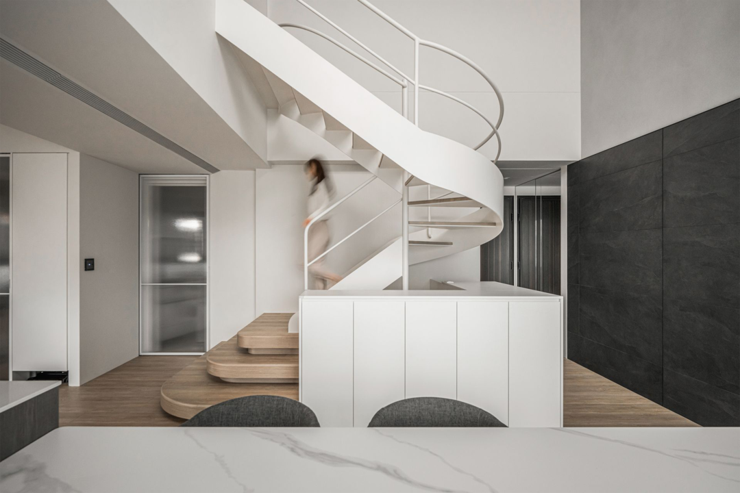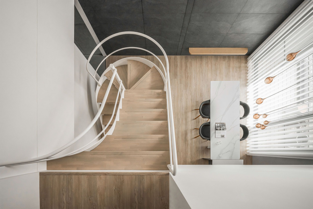 旋转楼梯设计感满满,拉近一楼与二楼之间的关系,同时设立在西厨区,还能起到整个公区的分区性。