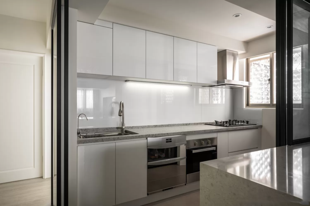 中式厨房进行了墙体拆改,以玻璃推拉门为隔断,既能确保空间的开阔性,又能保证空间独立性。洁白利落的开放式厨房,台面岩板上墙,便于业主日常打理。空间结构以一字型布局为主,浅色的地柜+吊柜一体化设计,视觉上还能弱化存在感。同时提前将家电内嵌其中,节省空间又统一大气。