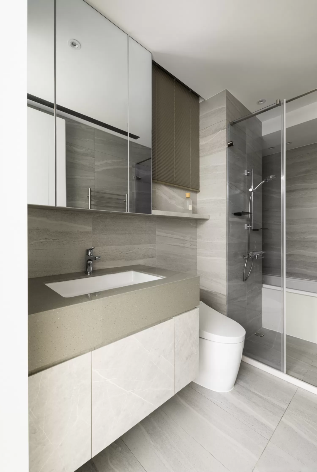 卫浴空间是以浅色为主,空间整体的通透性比较好,浅灰色的瓷砖通铺上墙。进门一侧则是壁挂式的浴室柜,台盆一体的设计日常方便清洁。可收纳的浴室镜增加空间的收纳性,定制置物架延伸至马桶上方,日常可以用来放置如厕的生活用品。靠墙则利用玻璃门为隔断,划分出独立的淋浴房,整个空间形成一字型动线,简约干净又利落。