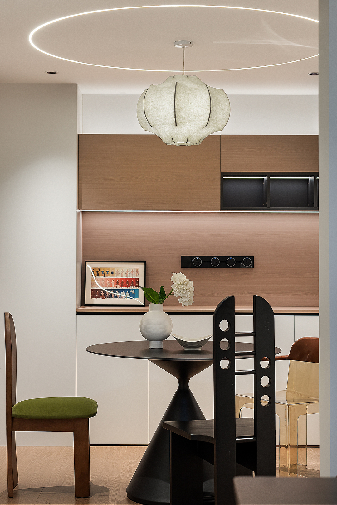 我们试图增强空间与空间的互动感,将客厅、餐厅、互动空间相结合,打造成为一个多元化复合空间。打破传统客厅布局追求非单一的生活体验,以人的生活轨迹构想空间场景变化,增强空间的互动性和趣味。