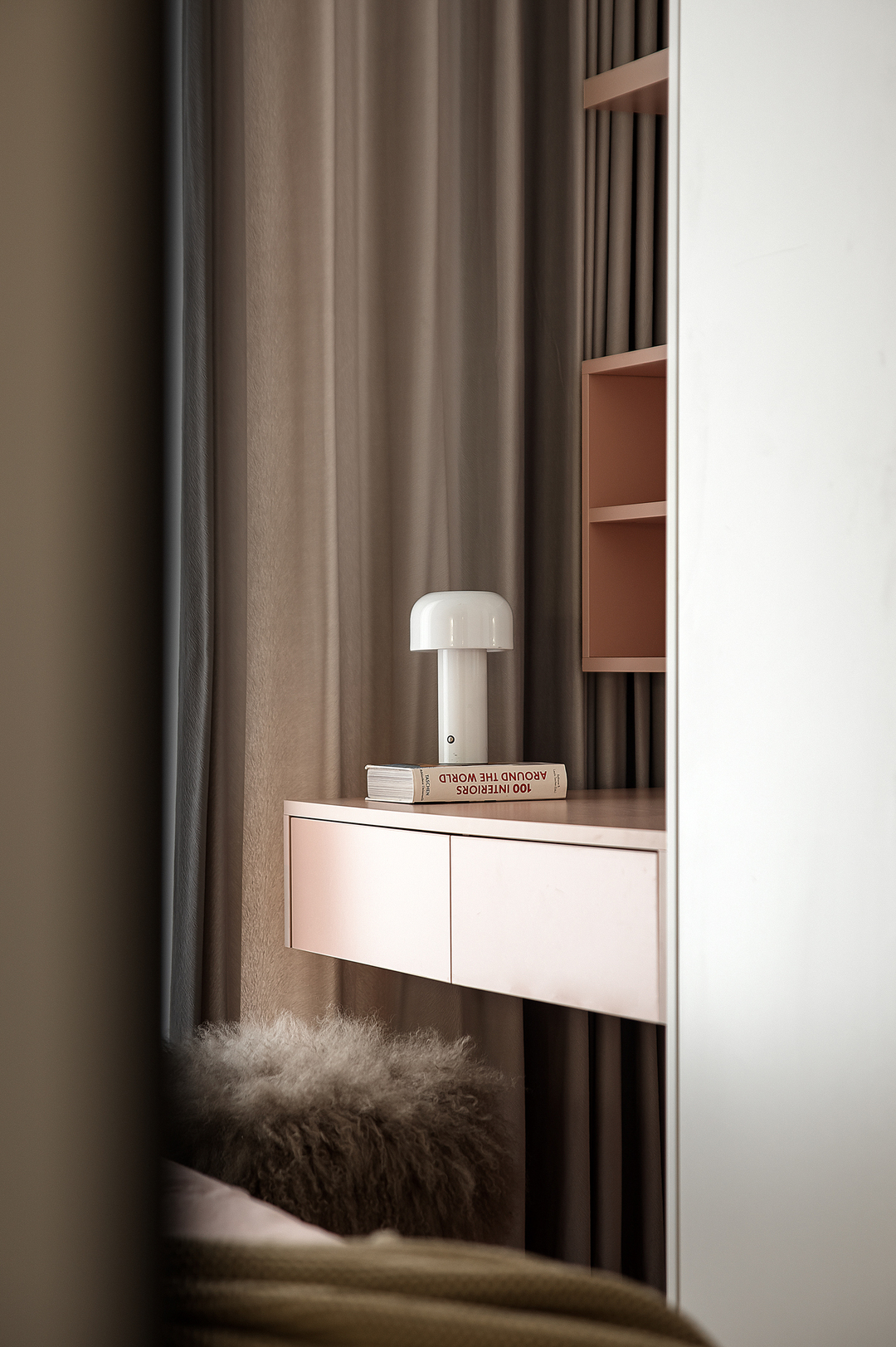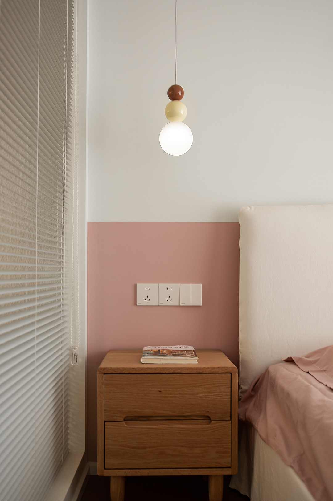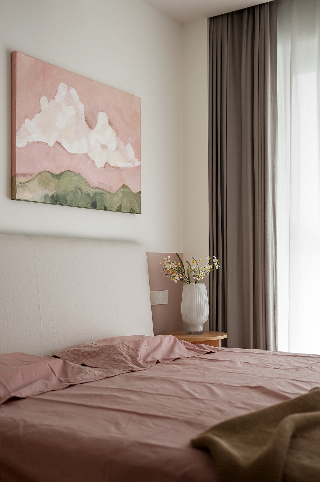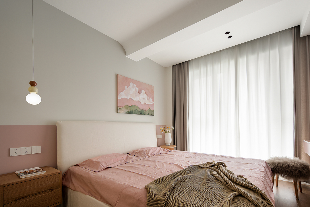 主卧是专属的悦己空间,根据居住者的习惯,定制使用场景。整个卧室以粉色为主调,意图打造一个温馨自然的家居环境。多功能台兼顾阅读、轻办公、美妆等需求,极具松弛感室内布置及色调,让日常生活更轻松愉悦。