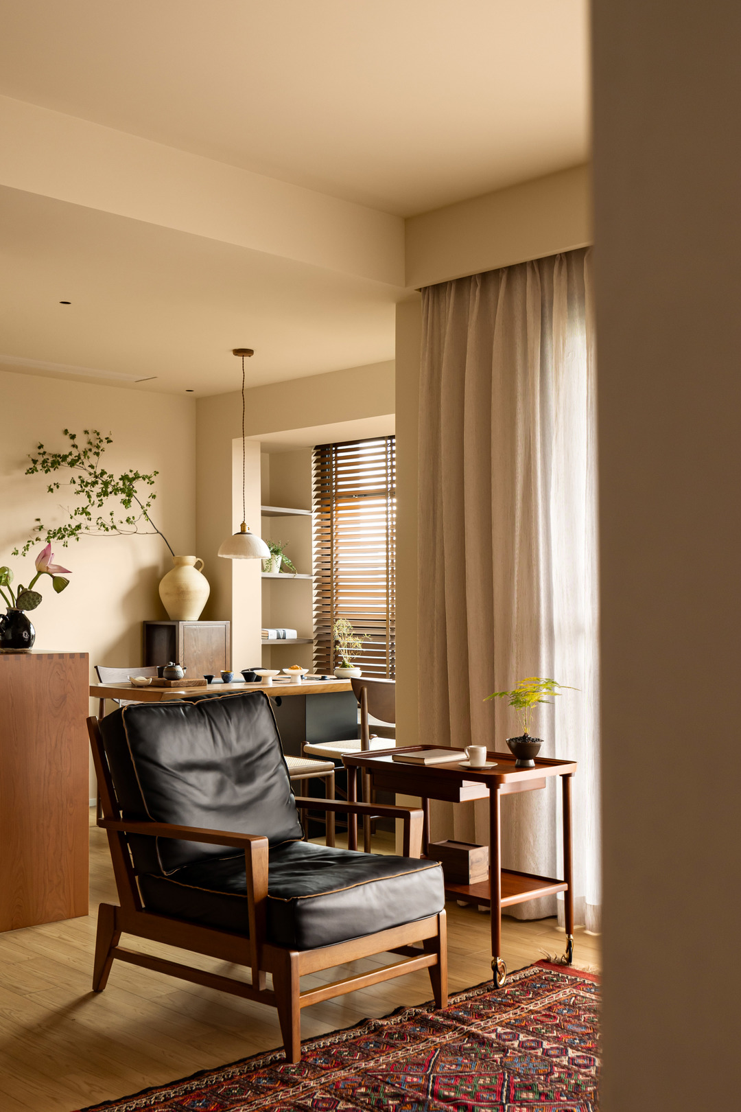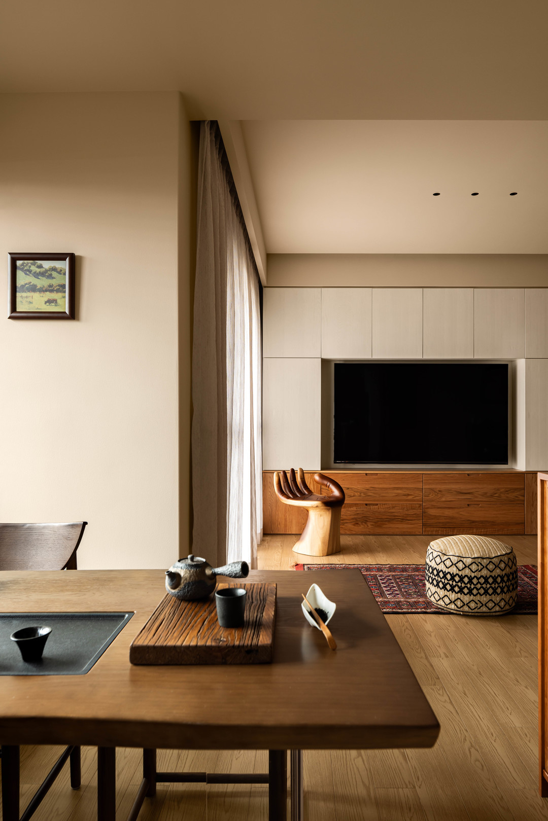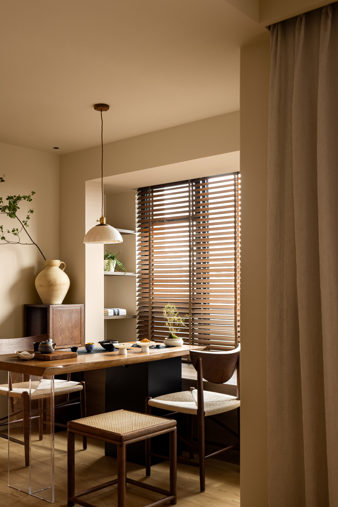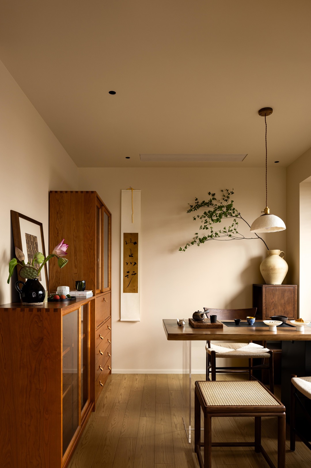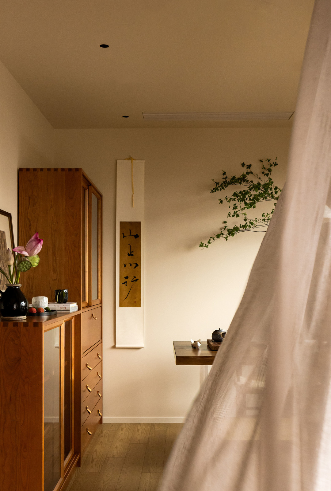 木质和低饱和围合的开放式茶室,塑造了一个自然、自我、精神和身体相互感知的亲密空间,更多的是感知静谧,让空间的情绪变得契合居者本身。