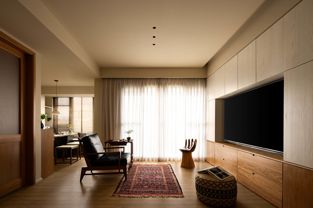 电视墙内嵌柜体,大量的收纳柜体被很好地融入空间,发挥着巨大的实用性,在生活的连续切面中,营造一个具有心灵归属感的家居空间。