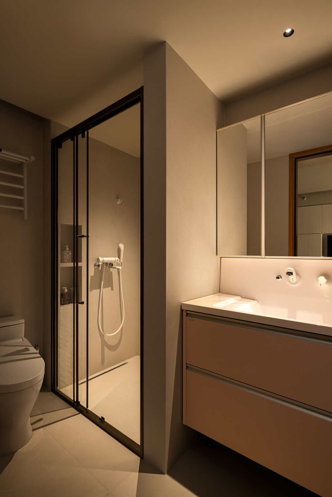 空间比例被重新调整后,客卫有了更富裕的空间,黑框玻璃门是干湿分离的执行者,微微泛着的温馨灯光效果,含蓄着表达着空间属性,也充满了温馨的意境。