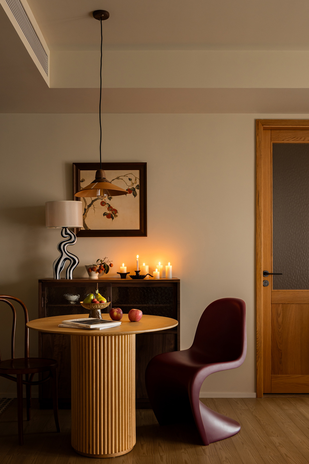 材料在空间中彰显它质感上的价值,手工蜡烛聚拢的温暖,激发了空间浓厚的生活氛围,对触觉和色调的探索贯穿了整个餐厅。