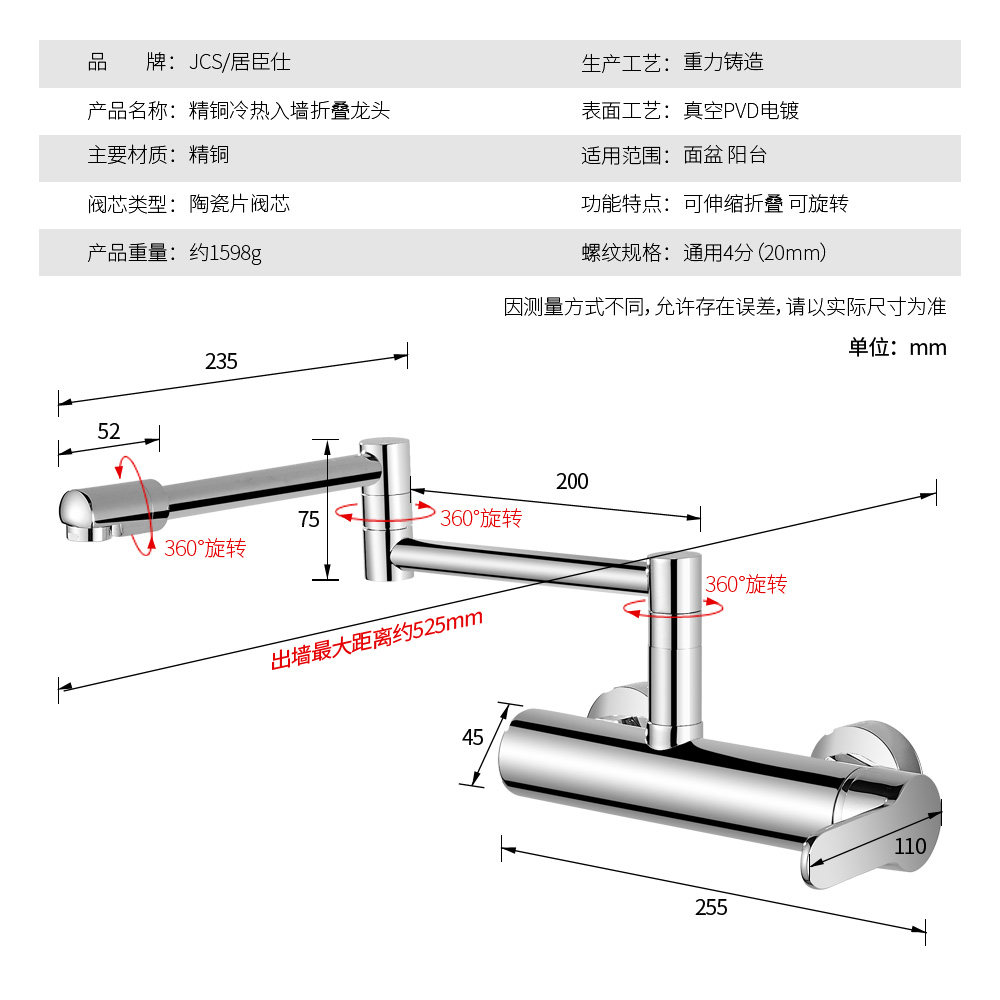居臣仕全铜入墙面盆冷热水龙头JCS5810