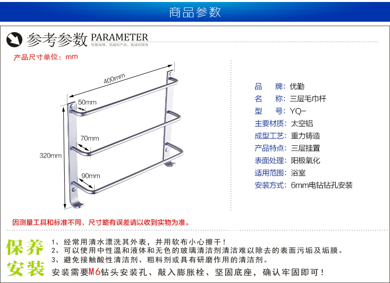 优勤毛巾架浴室三层毛巾架(太空铝)