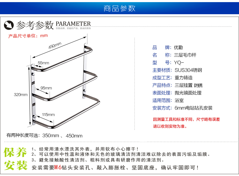 优勤卫浴浴室三层毛巾架(304不锈钢)