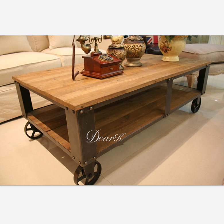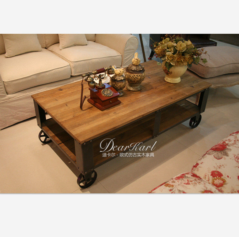 淘易家居美式铁艺复古实木带轮茶几